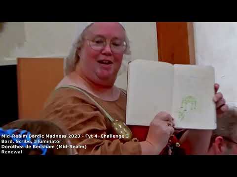 Renewal Bard Scribe Illumination: Renewal - Dorothea de Beckham Recorded at Mid-Realm Bardic Madness 2023 in the Shire of Narrental. Bard Scribe Illumination: Compose the text, write in calligraphy, and illuminate the page. This may be done individually or as a team, example: different people write the text, scribe the letters, and/or create the illumination. See your options for subject matter below. Read the finished product and amaze those around you at feast! |