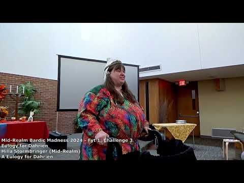 A Eulogy for Dahrien Eulogy for Dahrien: A Eulogy for Dahrien - Hilla Stormbringer Recorded at Mid-Realm Bardic Madness 2024 in the Barony of Roaring Wastes. Eulogy for Dahrien: Oh no, it's Dahrien? Wait, what? Dahrien is alive and well, but this year he's getting a break from being emcee, so let's give him the eulogy he does (or doesn't) deserve. |